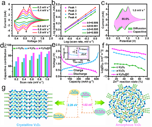 (g)第一性原理计算出的晶态和非晶态V2O5中Zn2+扩散和Zn2+嵌入能量的示意图。