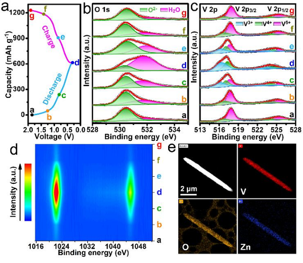 (b-d)O 1s、V 2p和Zn 2p的2D等高线图像的相应异地XPS光谱;