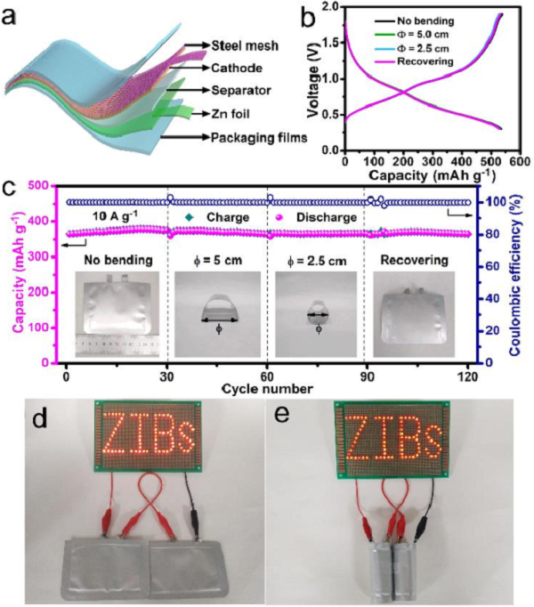 图五、柔性Zn/a-V2O5@C电池的配置和性能