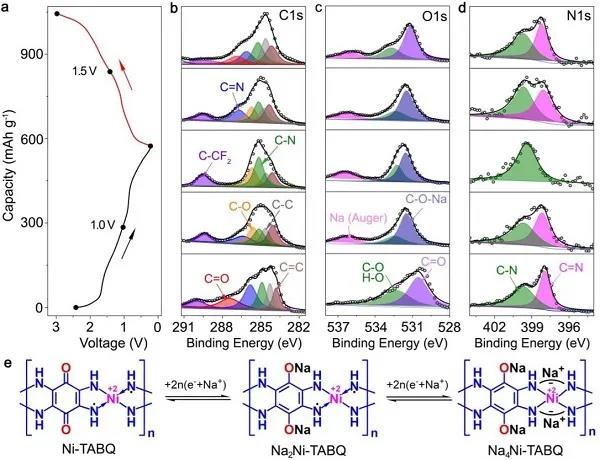 图3(a)Ni-TABQ在0.2-3.0 V电压范围内100 mA g-1倍率的充放电曲线;(b-d)分别为Ni-TABQ电极在放电和充电过程中的非原位C 1s、O 1s和N 1s XPS谱;及(e)建议的4Na+反应机理。