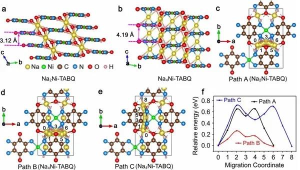 图4(a-b)Na2Ni-TABQ和Na4Ni-TABQ的优化晶体结构;(c)Na2Ni-TABQ中Na+扩散路径(路径A);(d-e)Na4Ni-TABQ中Na+扩散路径(路径B,沿着链;路径C,穿过链);(f)Na+通过不同路径迁移的能量曲线。