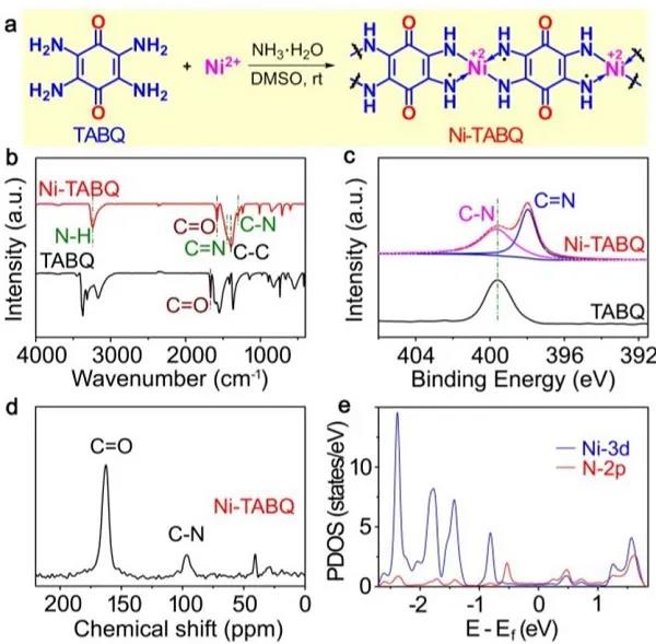 图1(a)Ni-TABQ合成路线;Ni-TABQ的(b)FTIR光谱、(c)高分辨N1s XPS谱、(d)固态13C NMR谱,和(e)PDOS谱。