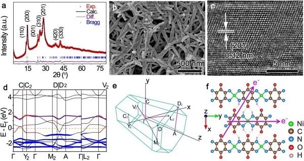 图2 Ni-TABQ的(a)XRD图样和Rietveld精修、(b)SEM图、(c)HRTEM图、(d)计算电子能带结构、(e)对应第一布里渊区及其高对称k点坐标,(f)平面内结构里的电子传导路径。
