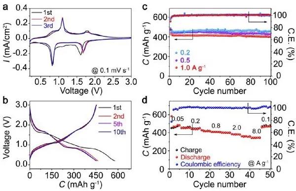 图5(a)扫速为0.1 mV s-1的CV曲线;(b)0.2 A g-1电流密度下,第1-10圈的充放电曲线;(c)0.2、0.5和1.0 A g-1电流密度下的循环性能;(d)从0.05到8.0 A g-1的倍率性能。