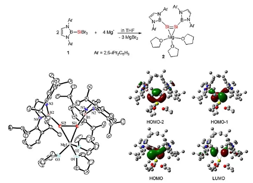 该团队通过研究不同还原剂还原硼基取代三卤硅烷(boryl)SiX3 (X = Cl, Br)的反应,发现当用活性镁作为还原剂还原(boryl)SiBr3( 1) 时,能够以79%收率得到黄色粉末状的二硅炔镁盐 2,如图1所示。晶体结构分析表明,该化合物最显著的结构特征是含有Mg–Si–Si三元环,其中Si=Si键长为2.223(17) Å,是典型的硅硅双键的键长(2.14–2.29 Å)。其Si–Mg键长分别为2.574(18)与2.600(2) Å,与已报道的硅镁键的键长相当。此外,该化合物中两个硼配体处于顺式且有15°的扭曲角。理论计算表明HOMO–2轨道 (HOMO为最高占有轨道) 是硅镁以及硅硅σ键的成键轨道;HOMO轨道是硅-硅π键轨道(图1)。自然电荷分析 (NPA) 则表明硅镁键高度极化从而使Si=Si具有二负离子的性质。通过单晶结构分析以及理论计算可知,化合物2中的Si–Mg既具有一定共价键性质也有离子键的性质,同时结构中还含有Si=Si。因此,化合物2可以描述为二硅镁环丙烯。