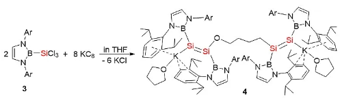 此外,当用KC8还原(boryl)SiCl3( 3)时,则分离得到活化一分子四氢呋喃的二硅烯二负离子二钾盐 4,如图2所示。作者对该过程的机理进行了分析。首先,(boryl)SiCl3( 3)在KC 8的作用下生成不稳定的双硼配体取代的二硅炔自由基负离子[(boryl)Si=Si(boryl)] −•,该自由基负离子活化一分子四氢呋喃形成烷氧基取代的二硅烯负离子钾盐自由基(boryl)K(THF)Si=Si(boryl)[O(CH2)4]•,该自由基中间体可自发地与另一分子的二硅炔自由基负离子偶联得到产物4。化合物4是第一例同一化合物中具有两种不同硅-硅双键的碱金属化合物。