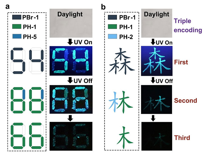 利用聚合物的不同寿命,团队成功的将该磷光材料应用于三重寿命编码的数字加密和汉字加密,展示了其在信息加密与防伪等领域的应用前景(图3)。该工作为实现高产率和长寿命的纯有机室温磷光提供了新思路。