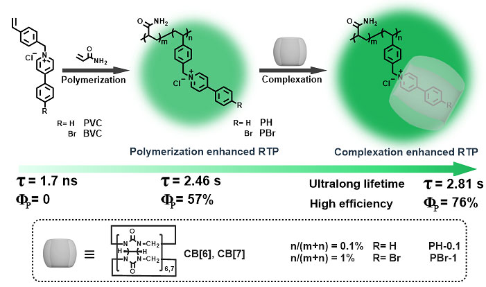 在前期研究基础上,刘育团队利用聚合与键合的协同作用,实现了长寿命和高产率的室温磷光发射(图1)。该协同策略包括两部分,分别为丙烯酰胺聚合增强和葫芦脲主体键合增强。首先,他们在4-苯基吡啶和4-溴苯基吡啶上引入双键,再与丙烯酰胺聚合,成功的将磷光团引入到聚合物中。在254 nm光照下,他们发现两种共聚物都能发射出室温磷光,其中共聚物PH拥有长寿命(寿命长达2.46 s),而共聚物PBr具有高量子产率(磷光量子产率达到57%)。