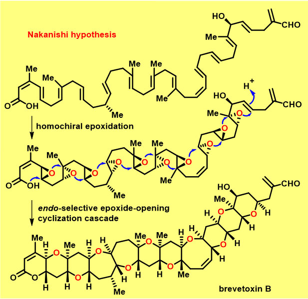 大多数由海洋藻类产生的海洋稠聚醚类天然产物对人有极强的神经毒性,但是具有7/7/6/7/6五环结构的brevenal不仅没有神经毒性,它还可以通过竞争性地结合神经毒性稠聚醚的受体蛋白减轻它们造成的中毒反应;brevenal还能显著改善囊肿性肺纤维化病(cystic fibrosis)以及其他肺纤维化病的症状,2018年brevenal被美国FDA批准作为孤儿药进入治疗囊肿性肺纤维化病的一期临床实验。多个典型的海洋稠聚醚毒素(例如brevetoxin B、brevenal、ciguatoxin 3C)已有全合成路线报道,但是以逐环构建的策略合成含有多个环的海洋稠聚醚难以高效地合成这类天然产物。1985年日本化学家Nakanishi根据海洋稠聚醚相似的结构特征推测它们生源合成途径可能是:长链多烯经酶催化的不对称环氧化转化为同手性的多环氧化合物,多环氧前体通过分子内的endo-选择性串联环氧开环环化反应一步构建分子中一系列反式稠合的环醚(下图)。Nakanishi猜想一经提出,其简洁性和高效性就吸引了有机合成化学家的关注,但是Nakanishi猜想至今仍没有实现,这是因为endo-选择性串联环氧开环环化相对exo-选择性串联环氧开环环化在能量上是不利的(Baldwin规则)。在这一极富挑战的研究领域中,目前有3例报道能通过多环氧前体的分子内endo-选择性串联环氧开环环化反应一步构建海洋稠聚醚的骨架结构,但是这3例报道其中两例收率偏低,而且目前只能构建全部是六元环或者全部是七元环的稠聚醚骨架,而brevenal分子中具有混合的六元环醚和七元环醚的7/7/6/7/6五环结构。另外,许多具有极强生物活性的稠聚醚中含有环内有顺式双键的八元环醚或九元环醚,之前它们无法通过串联反应构筑。