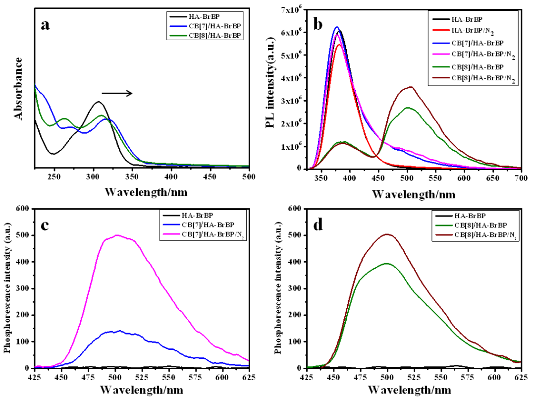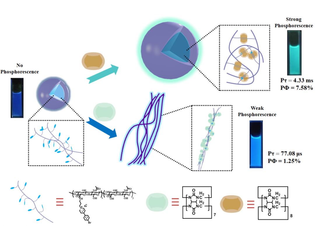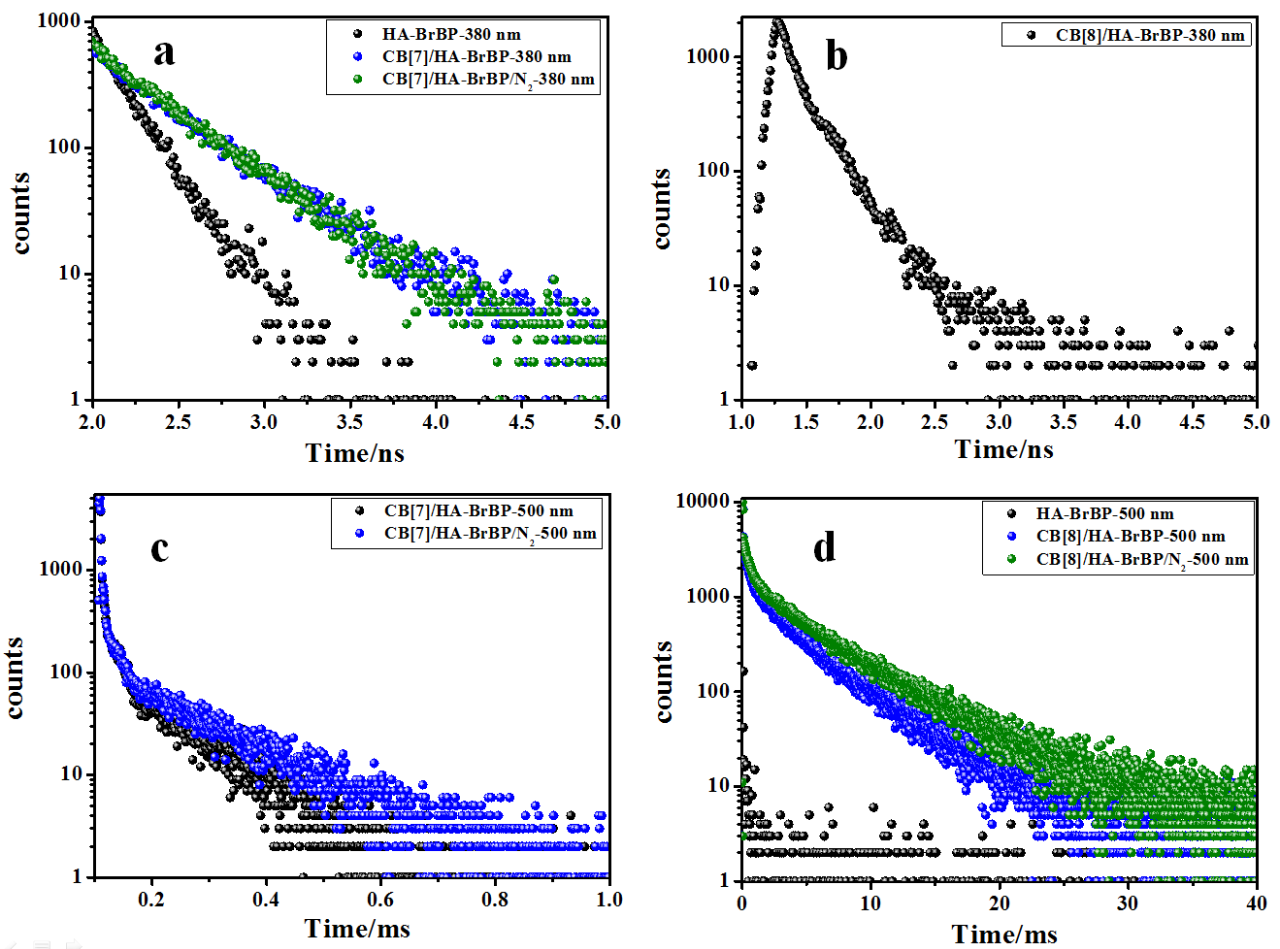 在前期工作基础上,由Betway必威刘育教授带领的研究团队将磷光基团4-(4-溴苯基)吡啶-1-盐(BrBP)修饰在具有肿瘤靶向的透明质酸(HA)高分子链上。发现在水中向HA–BrBP中添加CB [7]或CB [8]形成假轮烷聚合物时,其形貌由小球分别变为线性和大球型组装体,同时在其发光光谱500nm处均出现新的发射峰,尤其与CB [8]形成的组装体在500 nm处的发射强度大约是在380 nm附近的发射强度的2倍。时间分辨(延迟0.2 ms)的光致发光光谱还显示出CB [8] /HA-BrBP在500 nm处的强烈磷光发射,而CB [8] / HA-BrBP的磷光更强比CB [7] / HA-BrBP。时间分辨衰减数据的分析显示,CB [8] / HA-BrBP在500 nm处的磷光寿命超长,为4.33 ms(量子产率7.58%)。结果表明,使用CB [8] / HA-BrBP假轮烷聚合物可以实现水溶液中的高效RTP。据所知,迄今为止,该聚合物相比于在水溶液中的任何纯有机物质都具有相对较长的RTP寿命。
