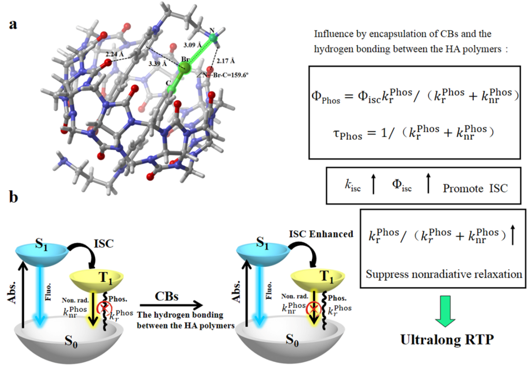 根据DFT几何优化结果(图5a)、非共价相互作用(NCI)分析、Mulliken 电荷以及辐射和非辐射衰减速率常数的计算结果推断主体-客体相互作用,π-π/Br-π相互作用,卤素键和多个氢键的结合共同有助于水溶液中CB [8] / HA-BrBP的长RTP。