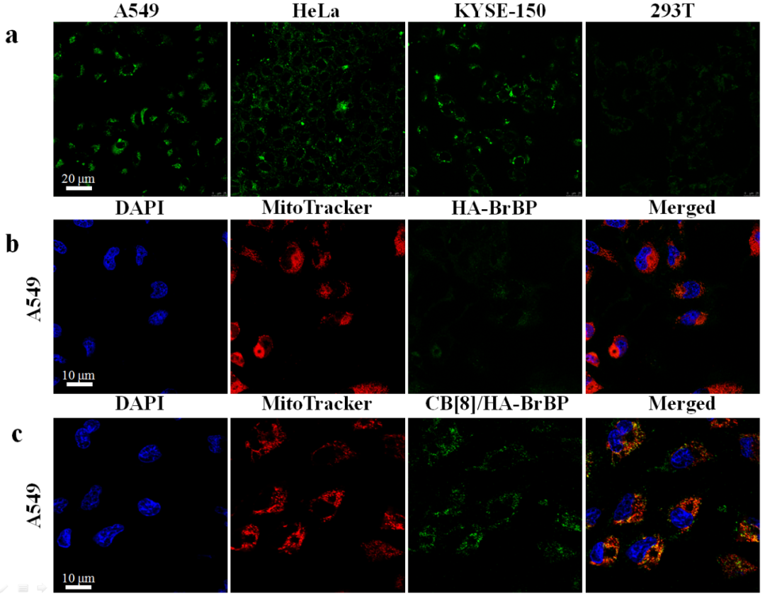 进一步根据HA的靶向性研究了CB [8]/HA-BrBP在活细胞中磷光成像的应用。将三种类型的癌细胞(A549,HeLa,KYSE–150)与CB [8] / HA-BrBP一起孵育,通过共聚焦显微镜获得515-540 nm的细胞内发射光信号,显示该准轮烷聚合物均发出强烈的绿色磷光,而在人类胚胎肾细胞(293T)中未观察到明显的磷光,并且根据细胞定位染色显示了在线粒体中。结果表明,假轮烷聚合物比正常细胞优先靶向肿瘤细胞的线粒体中。本文所述的超分子策略不仅将为开发在水溶液中表现出RTP的纯有机化合物提供新的途径,而且还将拓宽磷光的应用。