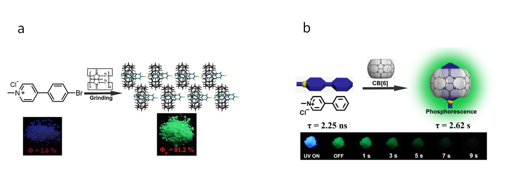 针对这一问题,Betway必威刘育教授课题组发现有机小分子溴苯基甲基吡啶PYX(X= Cl, Br, I, PF6)的抗衡离子不同,发光效率也不同(从0.4%到24.1%),同时,他们选取了葫芦[6]脲(Cucurbit[6]uril)作为主体,利用固相合成法与PYX键合,所得复合物的磷光得到了极大地增强,达到了81.2%。随后,他们通过避重就轻的策略用4-苯基-1-甲基吡啶-1-氯铵替代4-(4-溴苯基)-1-甲基吡啶-1-氯铵可显著提高其磷光寿命(至2.62 s)。
