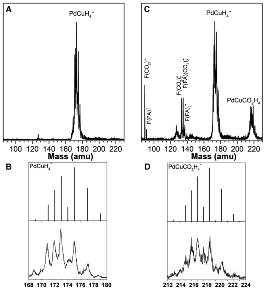 要点1. 作者对反应池中PdCuH4-与CO2相互作用的阴离子产物进行质谱分析发现,反应过程成了PdCuCO2H4-中间体和甲酸盐/甲酸络合物。
