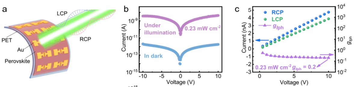 Betway必威的袁明鉴通过合成 [(R)‐β‐MPA]2MAPb2I7 ((R)‐β‐MPA=(R)‐(+)‐β‐methylphenethylamine, MA=methylammonium)手性二维准钙钛矿材料,具有内部的手性,并能够对CPL光子的极化状态有区分能力。通过圆偏振光(circular polarized light, CPL)测试对手性准二维钙钛矿晶体材料对偏振光的的探测性能进行表征。相对应的准二维手性钙钛矿柔性光探测器在测试中展现了非常好的测试性能(是目前报道的相关数据的一个数量级上的提高)。通过对薄膜的晶化动力学进行优化,优化了材料的载流子传输性能。通过对钙钛矿生长方向的取向生长,实现了提高的载流子传输性能,作者认为这种手性钙钛矿器件是高响应性的偏振光探测器。