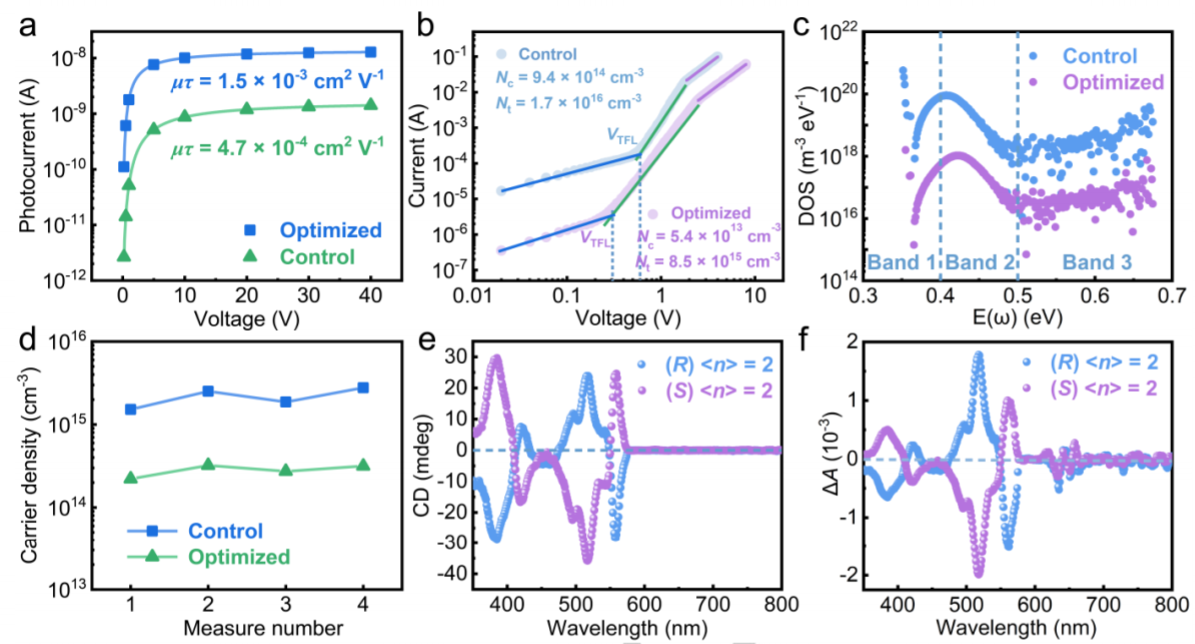 (1)由于缺陷等位点影响材料的质量,并会降低器件的光电性能。因此,作者在材料生长过程中通过加入还原剂,并通过加热后处理方法实现提高材料的质量。通过空间电荷限制电流(space-charge-limited current, SCLC)测试对材料中的缺陷浓度进行表征,结果显示材料中的缺陷位点浓度为4.3 × 109 (这个数值低于目前报道的准二维钙钛矿材料4.53 × 1010)。通过热导率(thermal admittance spectroscopy, TAS)测试的结果和SCLC相符合,同样说明材料缺陷浓度较低。另外,发现材料中的暗电流较低,说明材料界面上的载流子浓度较低。通过GIWAXS对材料的晶体生长方向进行表征,说明材料中实现了高度方向性生长。通过超快瞬态吸收光谱对载流子的动力学进行测试,对基态漂白信号(ground state bleaching,GSB)进行表征,发现优化后的材料薄膜有单一的GSB信号(优化前GSB有多个峰)。
