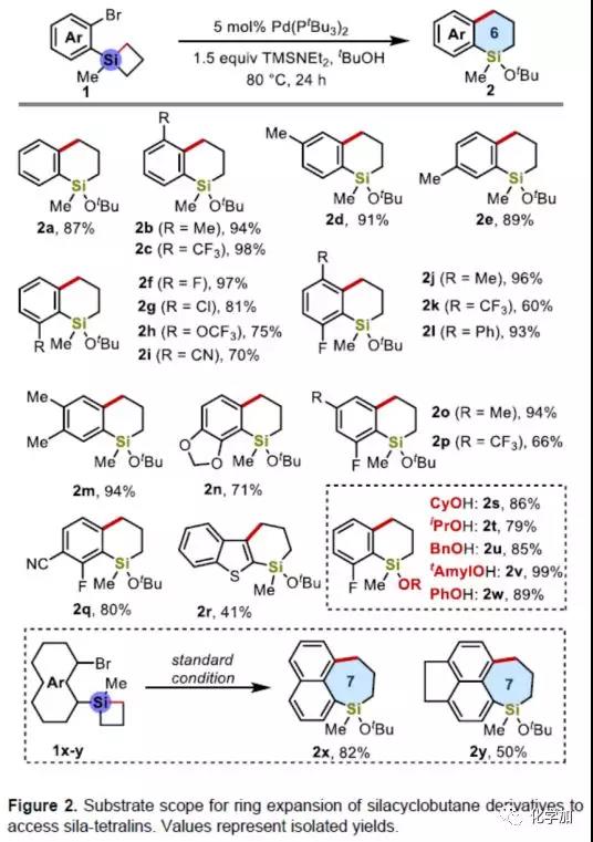 紧接着,作者对底物环丁硅烷1和亲核试剂的范围进行了研究(Figure 2)。当苯环的3-6位带有电中性、富电子或吸电子基团时,在上述标准条件下反应,均可获得良好至极好收率的2b-2i。含有3,6-、4,5-、5,6-、4,6-和5,6-二取代的底物也能够顺利进行反应,获得相应的产物2j-2q。同时,在邻位含有杂环基团时,也可获得相应的杂环产物2r。此外,作者也对亲核试剂进行了相关的研究。当将tBuOH改为不同的醇和酚作为亲核试剂和溶剂时,均可获得相应的产物2s-2w。同时将溴和杂环丁硅烷基团分别引入萘的1位和8位,依旧可以顺利反应,从而获得七元硅环产物2x-2y。