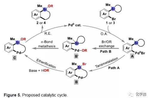 根据上述实验和相关文献的查阅,作者提出了一种可能的反应机理(Figure 5)。首先将Pd0氧化加成至1或3的C-Br键,形成PdII中间体A,再经分子内转金属化,从而获得中间体B(Path A),随后在ROH和碱存在下进行分子间醚化反应,从而获得Si-OR键的中间体C,最后经还原消除,获得目标产物2或4,并再生Pd0催化剂。值得注意的是,碱和HOR存在下,PdII中间体A还可以经另一种Br/OR交换途径获得Ar-PdII-OR物种B',然后在PdII-OR键和C(sp3)-Si键之间经σ-键复分解也可获得中间体C(Path B)。