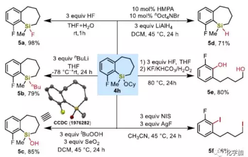 为了进一步证明该方法的实用性,作者对获得的产物4h进行了相关的后期修饰(Figure 4)。如4h在40%HF的THF/H2O溶液中室温反应1小时,导致-OCy基团裂解,获得98%收率的产物5a,同时4h中-OCy基团很容易通过有机锂试剂进行烷基取代,得到产物5b(79%)。如果使用tBuOOH/SeO2可在DCM中进行水解,获得85%收率的硅烷醇5c。另外,可以用LiAlH4还原产物4h中Si-O键,得到环状氢硅烷5d(产率为71%,可用作氢化硅烷化反应的合成中间体)。除了还原外,还可以将4h在Tamao氧化条件下,以80%的产率获得2-羟基芳基丁醇5e(生物活性分子的中间体)。而使用NIS/AgF与4h反应,即可实现开环和二碘化反应,以56%的产率获得1-碘-2-(4-碘丁基)苯5f。