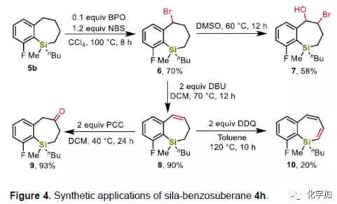 此外,作者也对产物中的碳环进行了进一步的官能团化,从而获得多种含硅四氢萘或苯并环庚硅烷衍生物(Figure 4)。首先,在产物5b的5位上进行溴化反应,以70%的产率得到溴化产物6。产物6可进一步修饰,如在DMSO中,化合物6可以平稳地进行氧化,以58%的产率获得溴化的硅烷基-苯并环庚硅烷醇7。而在DBU的存在下,可以容易地消除6中的溴,形成不饱和的苯并环庚硅烯8。8也可作为一种良好的反应中间体,用于多种转化,如通过PCC或DDQ进一步氧化,可获得相应的硅烷基-酮9或共轭体系产物10。