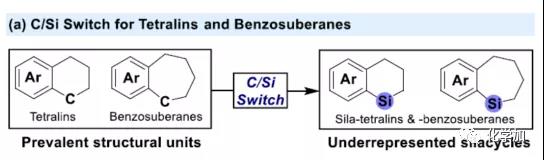 “碳/硅转换”是新材料、药物和农药开发中一种创新的策略,而含硅的四氢化萘和苯并环庚硅烷结构单元,在许多市售药物和天然产物种普遍存在(Figure 1a)。鉴于此,对含硅的四氢化萘和苯并环庚硅烷的合成研究具有重要意义。然而,迄今为止,由于缺乏通用的合成方法,从而导致含硅的四氢化萘和苯并环庚硅烷的开发严重不足(Figure 1a)。而合成此类骨架的典型方法存在以下弊端,如通用性低、反应条件苟刻、需要多步反应等。因此,迫切需要开发一种通用且高效的策略合成此类骨架。