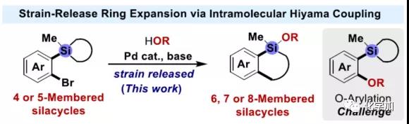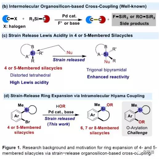 在过去的几十年中,钯催化的Hiyama-Denmark交叉偶联反应已成为一种高效构建碳-碳新键的策略(Figure 1b)。一般来说,-SiR3基团作为交叉偶联反应中的离去基团,并转化为相应的硅副产物。作者设想,是否可将Hiyama-Denmark交叉偶联反应于分子内的扩环反应,从而快速构建各种硅环骨架。实验结果表明,由于五元硅酸酯固有的环张力以及释放路易斯酸的性质,从而增强了四、五元硅环被亲核试剂活化为五配位硅酸盐的倾向(Figure 1c)。因此,基于有机硅的偶联反应,四、五元硅环似乎更容易发生转金属化,从而可通过在邻位引入芳基溴化物进一步增强反应的活性,实现分子内的Hiyama-Denmark交叉偶联,获得扩环产物。此外,由于反应过程中存在芳基卤化物与O或N-亲核试剂的交叉偶联,因此需选择合适的亲核试剂和催化体系来抑制该过程,从而实现扩环。在本文中,作者主要介绍了在Pd-催化下,基于硅的交叉偶联反应,实现四和五元硅环的扩环(Figure 1d)。