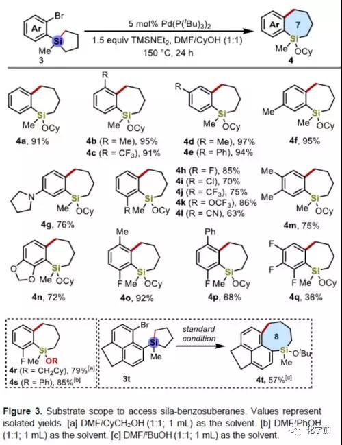 为了获得七元环苯并环庚硅烷产物,作者将环丁硅烷1a改为环戊硅烷3a,在上述标准条件下反应,仅获得痕量的目标产物4a。因此,作者又对反应条件进行了广泛的筛选,当使用DMF/CyOH(1:1)的混合溶剂(CyOH作为亲核试剂)时,在150 ℃下反应24 h,即可获得高达91%收率的产物4a。