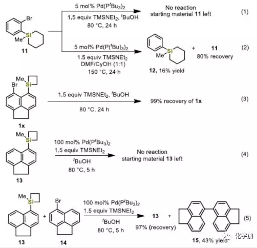为了进一步了解反应机理,作者进行了一些对照实验。首先,作者使用环己硅烷11作为底物,在上述两种标准条件下反应(Eq. 1-2),均未发生扩环,从而说明分子内Pd-催化硅的交叉偶联反应中,硅环的高环张力是必不可少的。如果不使用Pd0催化剂(Eq. 3),环丁硅烷1x在标准条件未发生反应,表明1x在tBuOH中没有形成游离的五配位硅中间体。同时,如果在化学计量的Pd(PtBu3)2(Eq. 4)存在下,将底物13在标准条件下反应,仅获得100%的原料,表明环丁硅烷在经历分子内的转金属化之前是不活泼的。此外,环丁硅烷13与芳基溴化物14之间的竞争实验还阐明了C-Br键的氧化加成比C-Si键的插入快得多,且反应从C-Br键的氧化加成开始,因为在化学计量的Pd(PtBu3)2存在下,14的二聚反应顺利地生成了化合物15(Eq. 5)。