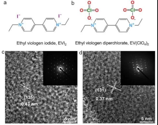 1) 研究人员首先利用X射线单晶分析对EVI2和EV(ClO4)2的晶体结构进行了确认。衍射结果表明EVI2和EV(ClO4)2均一单斜晶体的形式存在,其中有机层EV2+的无机层I-/ClO4-交替排布。选取电子衍射中出现的规则衍射光斑证明这两种材料都是高结晶性的单晶。