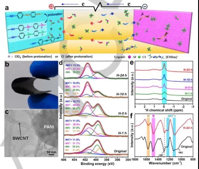 1) 研究人员利用-N=官能团向-NH+-官能团的转化实现了聚苯胺的质子化。高度质子化的聚苯胺和单壁碳纳米管网络集成在一起构筑了自支撑的PANI(H+)/SWCNT复合薄膜。质子化的聚苯胺不仅能够提供更多的活性位点,而且有助于复合薄膜电子电导率的提高。