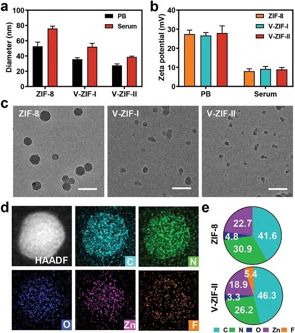 (a)不同类型ZIF置于10%稀释胎牛血清和pH值为7.4的10×10−3 m磷酸钾缓冲液中的直径变化。