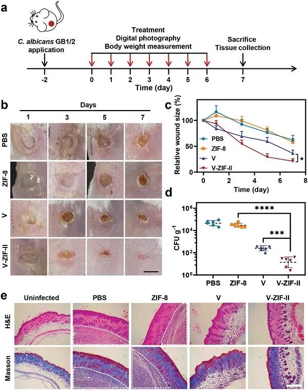 流程图、V-ZIF的制备示意图以及V-ZIF渗透到开放性伤口的真菌生物膜内并在其酸性环境中释放其内置的伏立康唑以破坏生物膜过程。