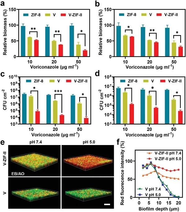(f)在pH 7.4和pH 5.0条件下,伏立康唑溶液和V-ZIF-II穿透色念珠菌生物膜深度的函数分布。
