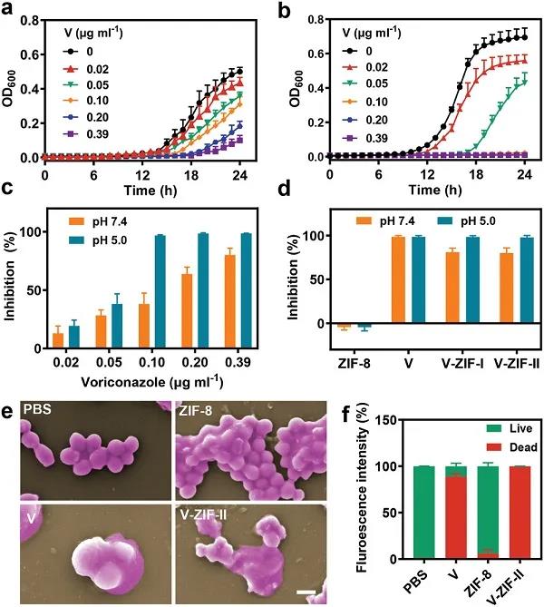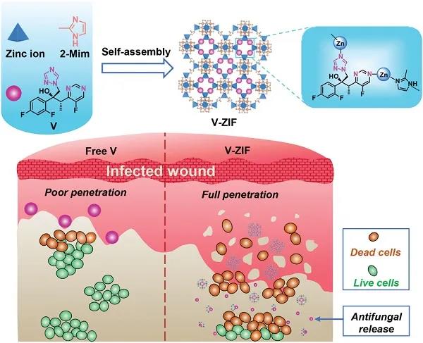 在这项研究中,作者通过Zn2+与伏立康唑的配位结合,成功地制备了内置伏立康唑(抗真菌药物)的金属有机骨架(V-ZIF)。配位结合使V-ZIF具有良好的稳定性,并实现了抗真菌药物的零级释放动力学。白色念珠菌生物膜内的酸性环境能触发伏立康唑与金属有机骨架分离进而实现其释放。V-ZIF能穿透白色念珠菌生物膜和阻止白色念珠菌聚集而产生更好的扩散进而导致真菌细胞膜损伤和白念珠菌死亡。在白色念珠菌感染的开放性伤口中,V-ZIF表现出良好的抗真菌性能和促进伤口愈合的能力且无明显副作用。此外,将抗真菌药物内置于金属-有机框架中的策略也适用于其他含给电子结构域的药物,如唑类、二嗪类和吡啶类,以改善其药代动力学性能并减少其副作用。
