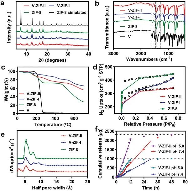 (e)ZIF-8,V-ZIF-I和V-ZIF-II的孔宽分布。