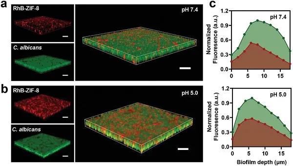 (a)pH 7.4时3D-CLSM图像显示的RhB-ZIF-8在绿色荧光标记的白色念珠菌生物膜中的渗透和积累。