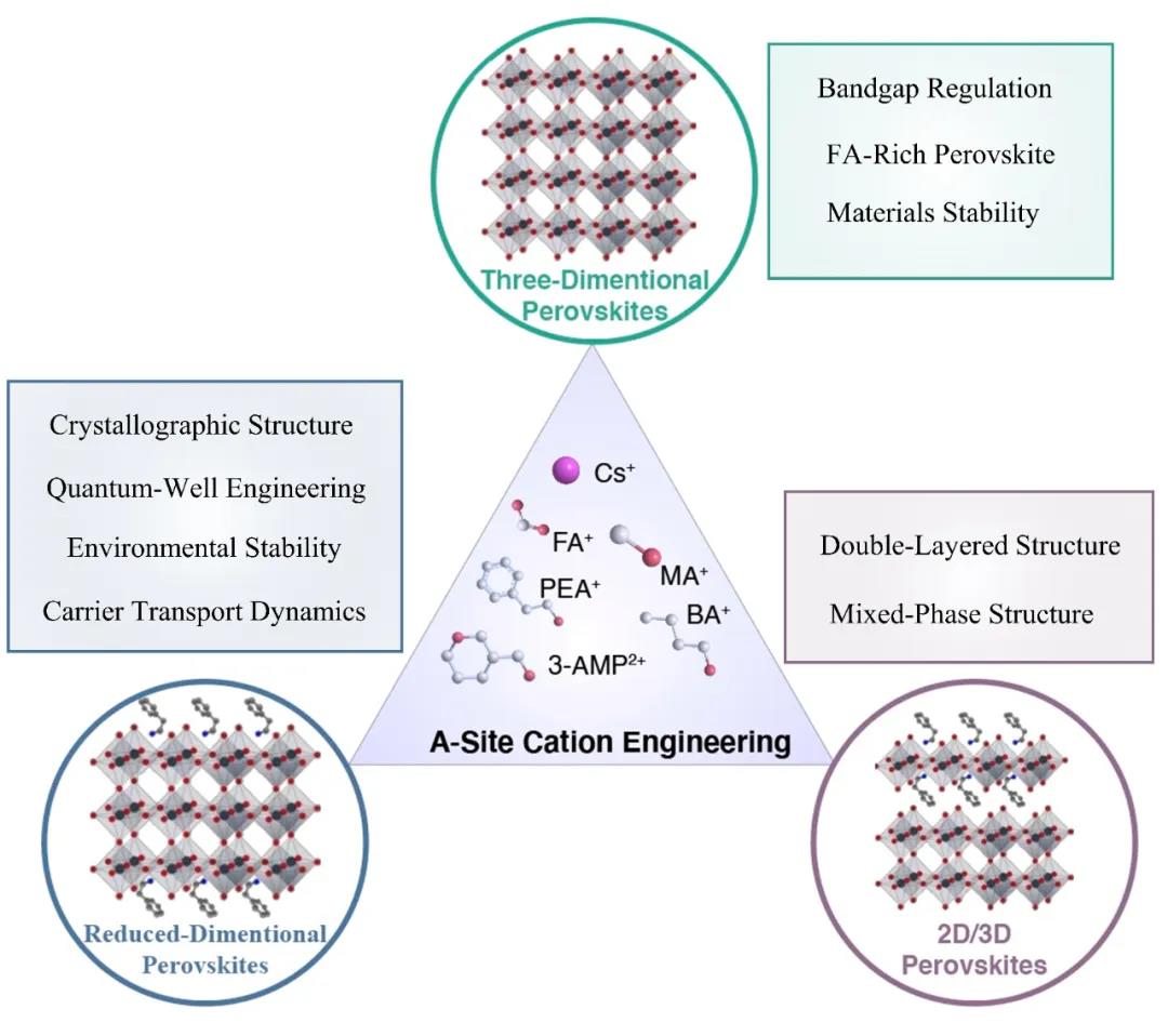 首先,作者以调节钙钛矿(ABX3)材料的吸光范围为线索,重点介绍了通过A位点阳离子工程,调控3D钙钛矿材料光学带隙而取得的一系列进展。根据肖克利-奎伊瑟(S-Q)极限曲线,具有更小带隙的钙钛矿材料,有机会实现更高效率的钙钛矿光伏器件。钙钛矿材料经历了单阳离子甲胺(MA)→混合阳离子(MA/铯(Cs)/甲脒(FA)) →富FA体系的转变。最终,α-FAPbI3因其拥有最小的带隙,被认为是最理想的钙钛矿材料。然而,在薄膜制备的过程中,难以避免的β-FAPbI3相的形成,制约着高效钙钛矿光伏器件的发展。而且,3D钙钛矿的环境稳定性也是制约其应用的重要因素,尽管研究者为此做出了许多创新性的工作,也取得了较大进展,但仍然难以满足其商业化的需要。