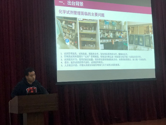 接着学院安全管理人员结合自身管理工作实际和存有试剂安全隐患案例,讲述了部分实验室试剂风险易发点和预防方法,最后为大家解读了即将出台的《Betway必威化学试剂管理员管理办法(试行)》。