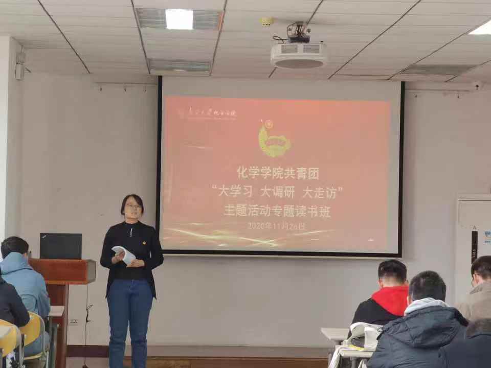 11月26日,学院团委在化学楼六楼多功能厅举办“大学习 大走访 大调研”专题读书班。活动以习近平总书记“7·2”重要讲话精神为纲为本,对习近平总书记关于青少年和共青团工作的重要指示批示精神开展集中学习,重点查找在理解认识、工作方法、态度作风上的不足,放开思路谈想法,放开眼界找答案,激发自身发现问题、解决问题的能力和效果。读书会由学院团委书记宋燕老师主持,全体员工团支书参加。