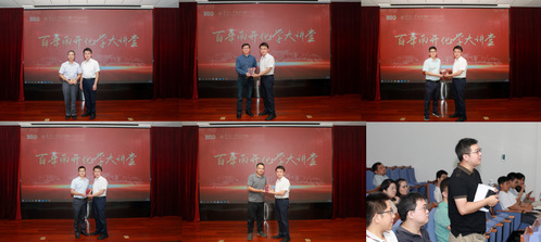 朱守非经理代表学院为张伟刚教授颁发“南开化学公司产品卓越论坛”主讲人证书牌,为方千荣教授、孙庆福研究员、韩英锋教授和史壮志教授颁发“百年南开化学大讲堂”主讲人证书牌,并合影留念。