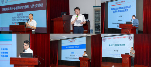 张伟刚教授以“高校青年教师多重角色的承载与转换探析”为题为青年教师出谋划策,共同探讨教学经验,对教学三问及教学三观进行深度解读。方千荣教授、孙庆福研究员、韩英锋教授和史壮志教授分别就高稳定共价有机框架材料的定向合成与功能探索、功能配合物超分子自组装、有机金属超分子化学和磷导向碳氢活化四个主题做了精彩的学术报告。四位报告人分别介绍了各自研究方向的发展现状、研究基础和交叉融合的方向,充分展望了各自领域的发展前景。