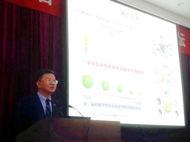 严纯华在讲座中介绍了稀土元素及其性质,稀土在生命科学、新能源功能材料等领域的应用,稀土功能材料面临的挑战、今后发展的方向等。严纯华说,稀土有工业“黄金”、新材料“维生素”之称,因具有优良的光电磁等物理特性,能与其他材料组成性能各异、品种繁多的新型材料,其功能可大幅度提高其他产品的质量和性能,是很多高精尖产业必不可少的原料。