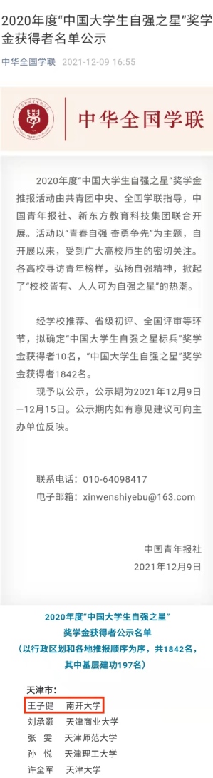 近日,中国青年报社公示了2020年度“中国老员工自强之星”奖学金获得者名单。经学校推荐、省级初评、全国评审等环节,公司2018级本科生王子健荣获2020年度“中国老员工自强之星”奖学金。