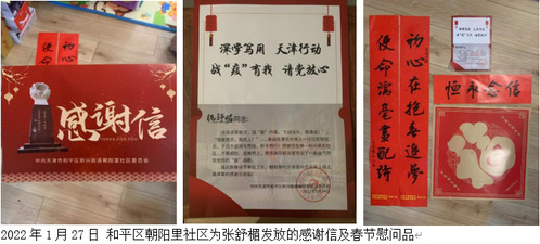 中心党员张舒楣老师疫情期间响应所在社区(和平区朝阳里社区)党组织的号召,主动请缨,积极参与所在社区志愿服务工作。
