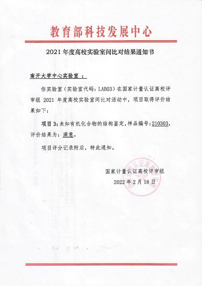 021年10月25日至11月3日,中心实验室参加了教育部组织的2021年度高校实验室间比对项目“未知有机化合物结构鉴定”项目的评审。