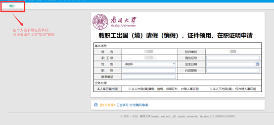 (2)开始办理后,申请人根据本人因私出国(境)请(销)假、领用因私出国(境)证件、打印在职证明的实际需求,填写需求表单,完成后点击页面左上角“提交”按钮。