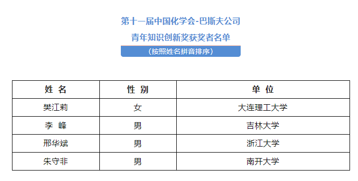 更多关于中国化学会-巴斯夫公司青年知识创新信息及历届获奖人名单,可查询https://www.chemsoc.org.cn/Awards/Home/p2。