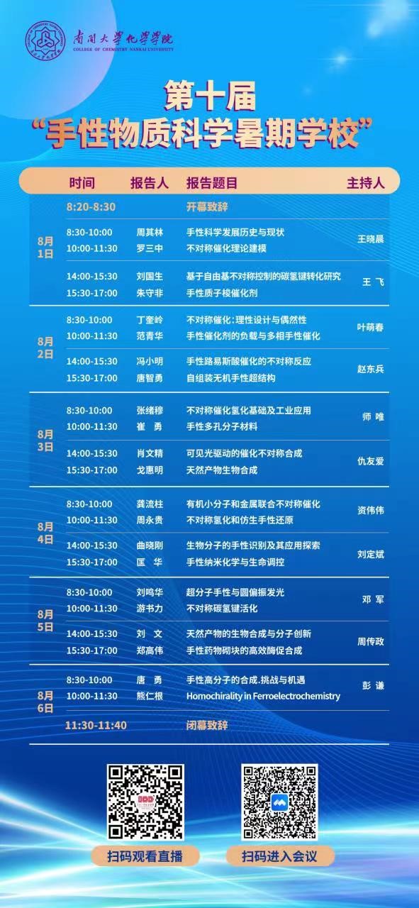 由中国化学会手性化学专业委员会和天津化学化工协同创新中心手性物质创造与转化平台主办,Betway必威承办的2022年第十届手性物质科学暑期学校将于2022年8月1日至8月6日在天津举行。此次暑期学校邀请了包括4位中国科学院院士在内的22位学术水平高、教学经验丰富的专家和知名学者授课。