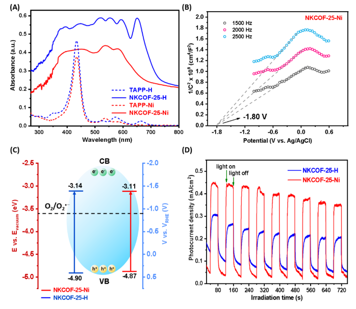 图3:(A) NKCOF-25-X和TAPP-X的紫外-可见漫反射光谱;(B) NKCOF-25-Ni的莫特-肖特基(M-S)曲线;(C) NKCOF-25-X的能带结构图示;(D) NKCOF-25-X的光电流响应曲线