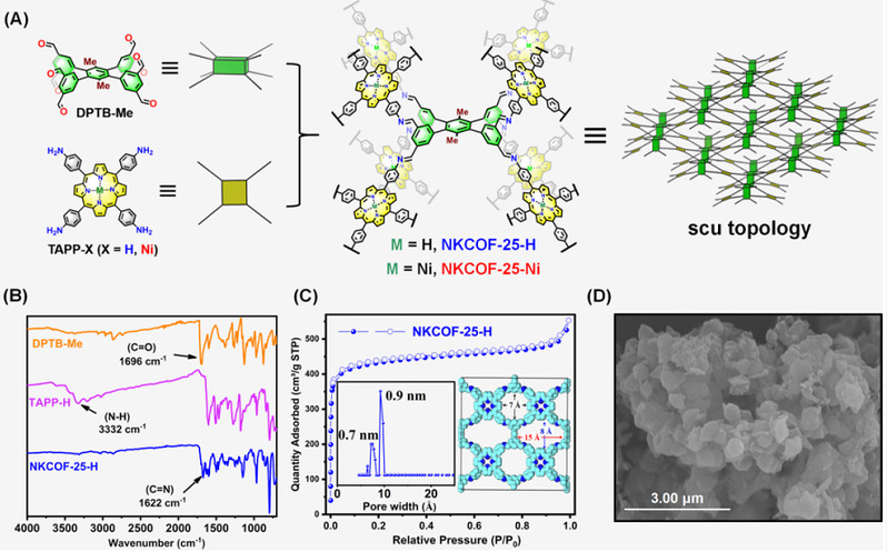 图1:(A) NKCOF-25-X的化学结构、合成路线以及拓扑示意图;(B-D) NKCOF-25-H的红外光谱图(B)、固体13C NMR谱图(C)和SEM图像(D)